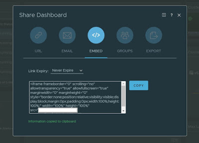 Use Case – The use case is pretty obvious. In organizations where vRealize Operations data can be consumed by different departments, BUs, groups etc, the Operations admin can provide embed code with specific dashboard URLs to the consumers of this dashboard. This embed code can be used to embed the dashboard in an external webpage, confluence page, sharepoint, through a simple iframe.