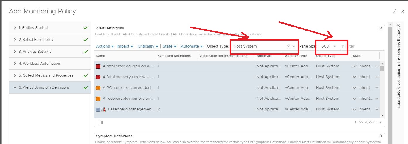 4- Click on Alerts and Symptom Definitions and filter the list of aletrs with only host system alerts. We want a filtered list so that we can disable these in one go.