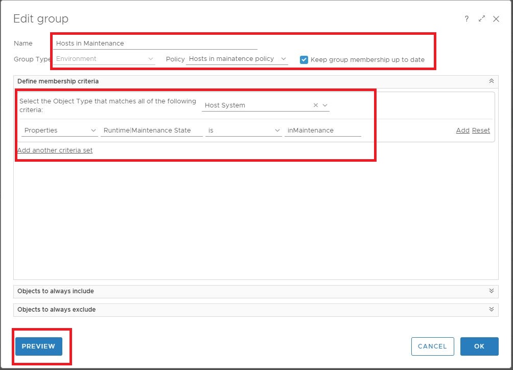 8- Create a new custom group named “Hosts in Maintenance”. Use the following creiteria to dynamically add members to this custom group based on ESXi host property which vROps collects every 5 minutes.