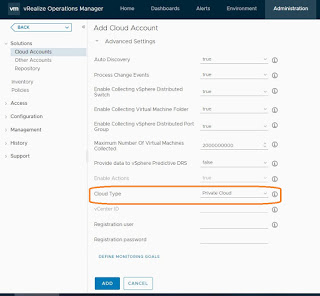 Choosing the right cloud type is important to ensure that vROps understand the vCenter endpoint and apply the correct business logic for use cases such as compliance, costing and monitoring.