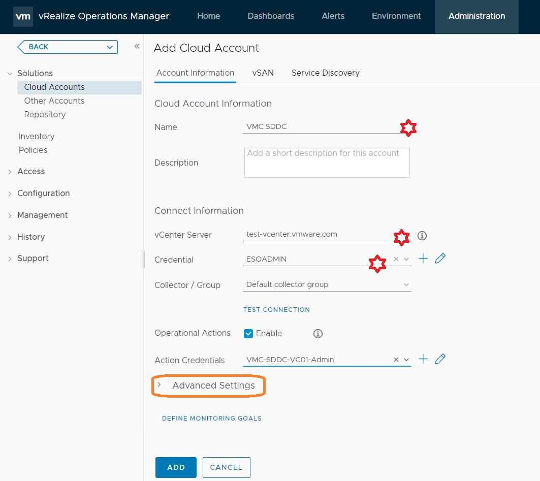 8- If you are running vROps 7.5 or prior, you will save this adapter configuration and then configure the vSAN adapter to collect data from vSAN in VMC. However with vROps 8.0, this is a simple one click enable option within vCenter Cloud Account.